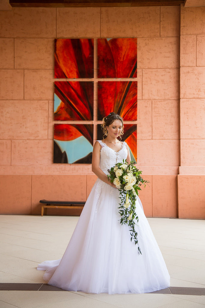 Classic Corset Wedding Dress with Lace Straps and Full Skirt.