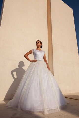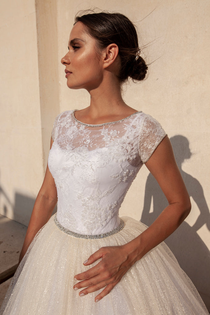 - Delicate decoration with rhinestone ribbons and sequin and bead embroidery.